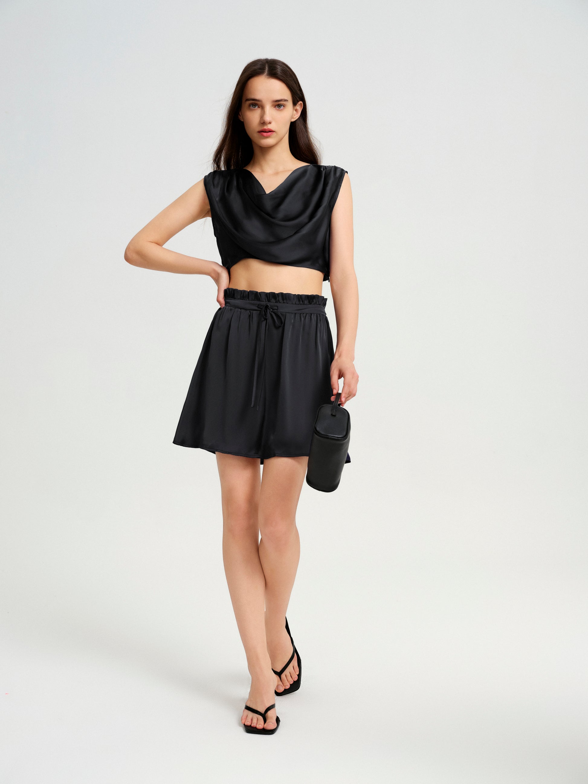 BlisSecret Black Cowl Neck Cropped Top With Pleated Padded Shoulder & Shorts
