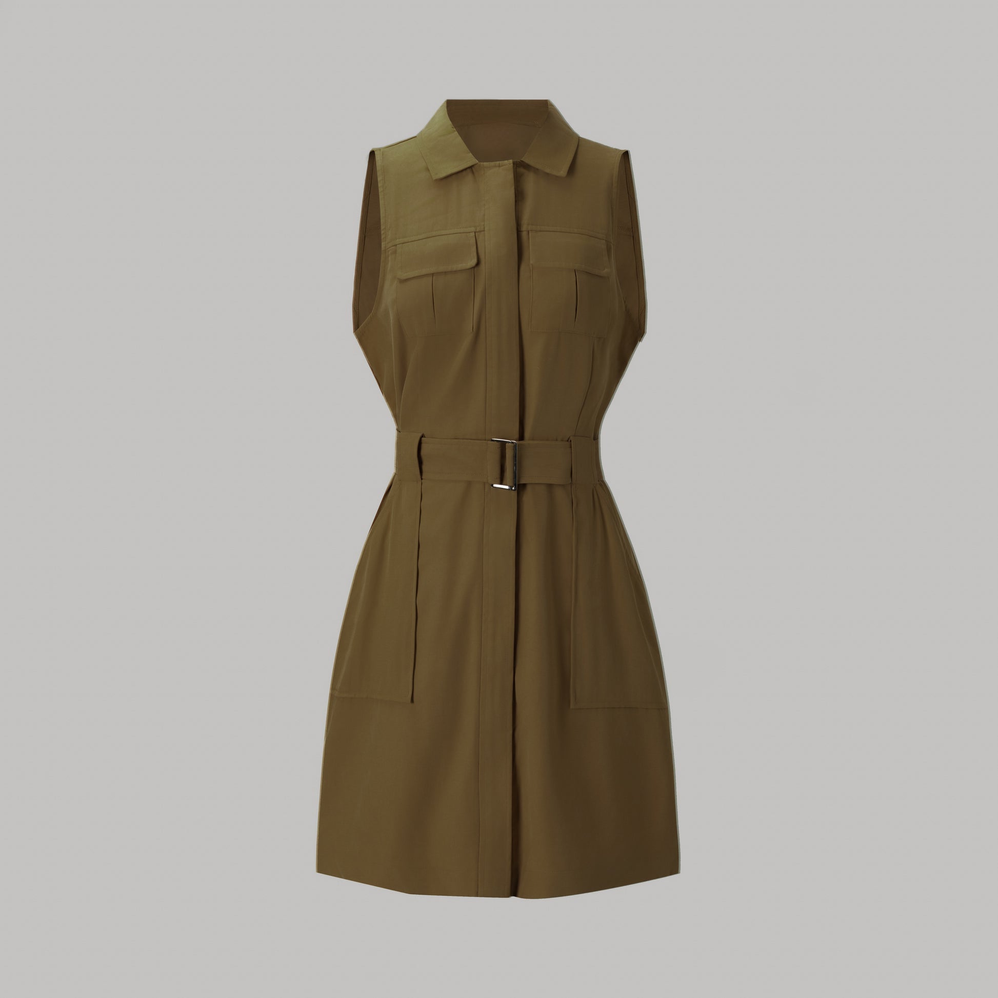 - Utility-inspired drapey dress with four front pockets for added functionality.