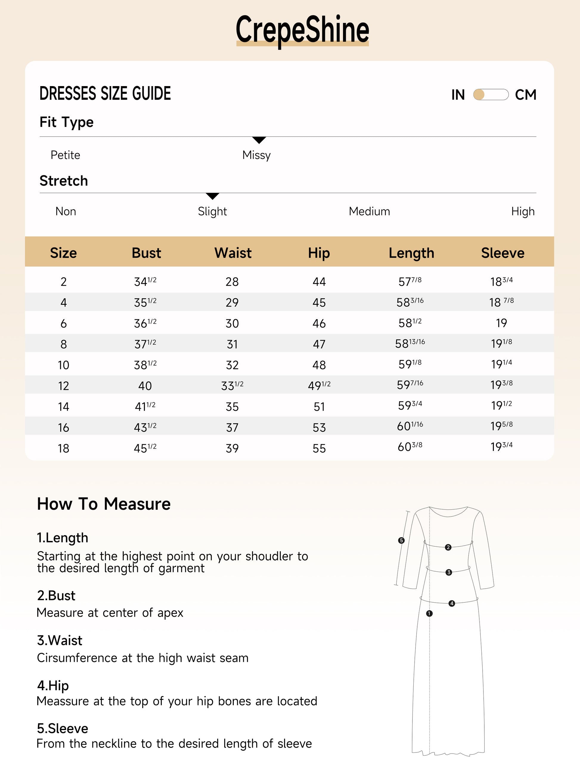 Name 2 4 6 8 10 12 14 16 BODY LENGTH FRONT FROM HPS 57 7/8 58 3/16 58 1/2 58 13/16 59 1/8 59 7/16 59 3/4 60 1/16 BODY LENGTH FROM CBN 50 5/8 50 13/16 51 51 3/16 51 3/8 51 9/16 51 3/4 51 15/16