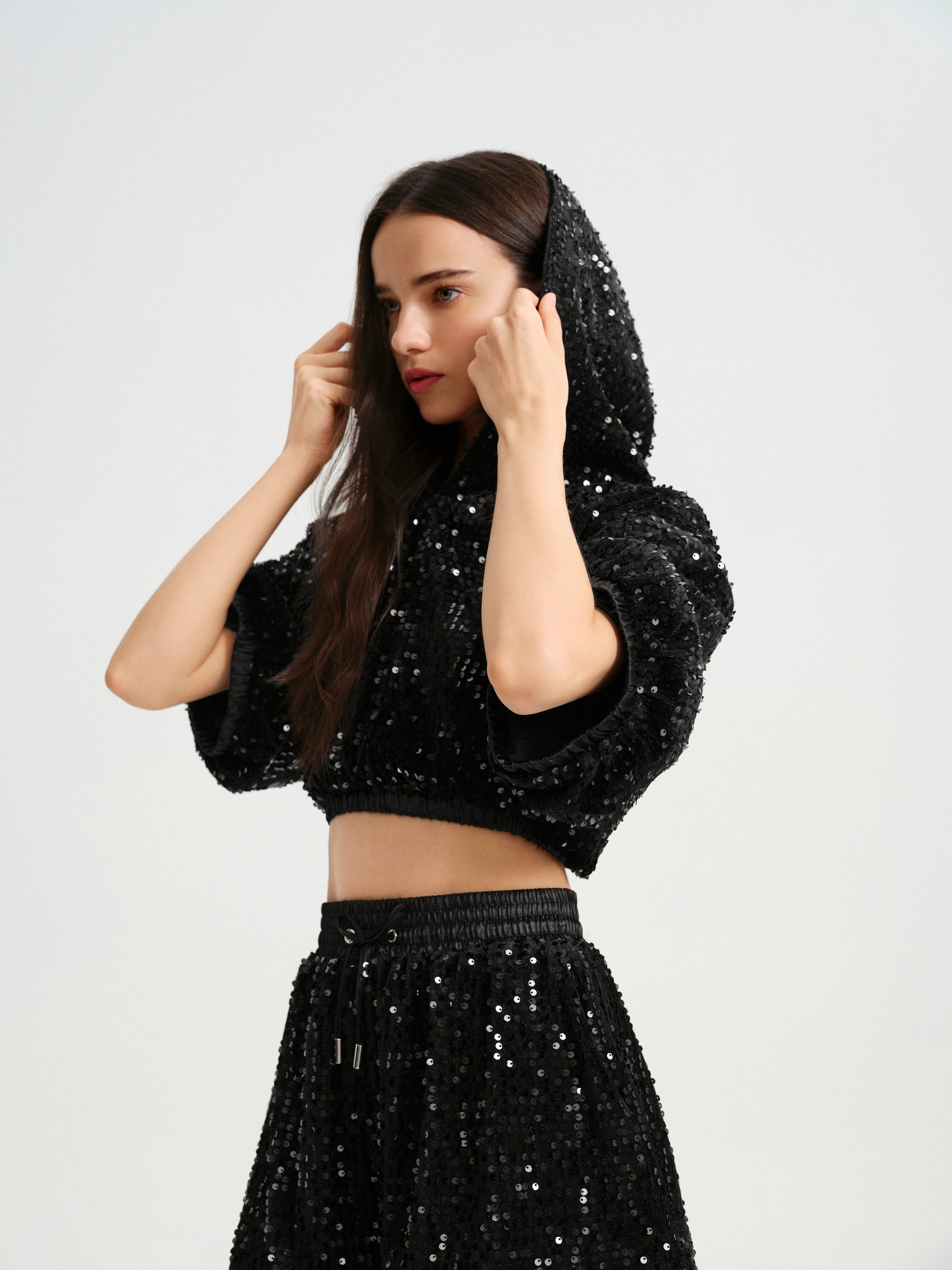 - Embellished with sequins on velvet fabric, blending casual comfort with a touch of elegance.