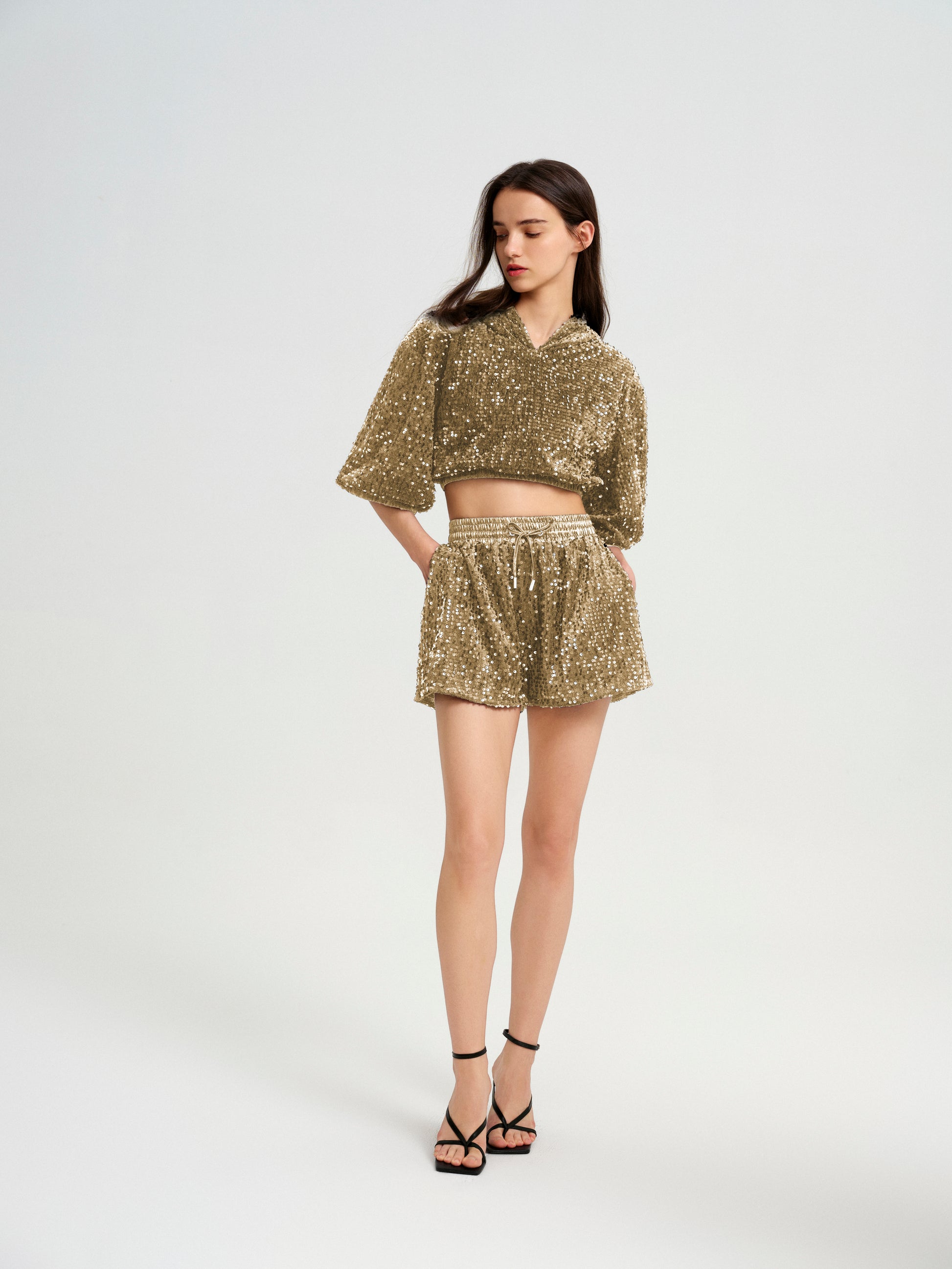 - Embellished with sequins on velvet fabric, blending casual comfort with a touch of elegance.