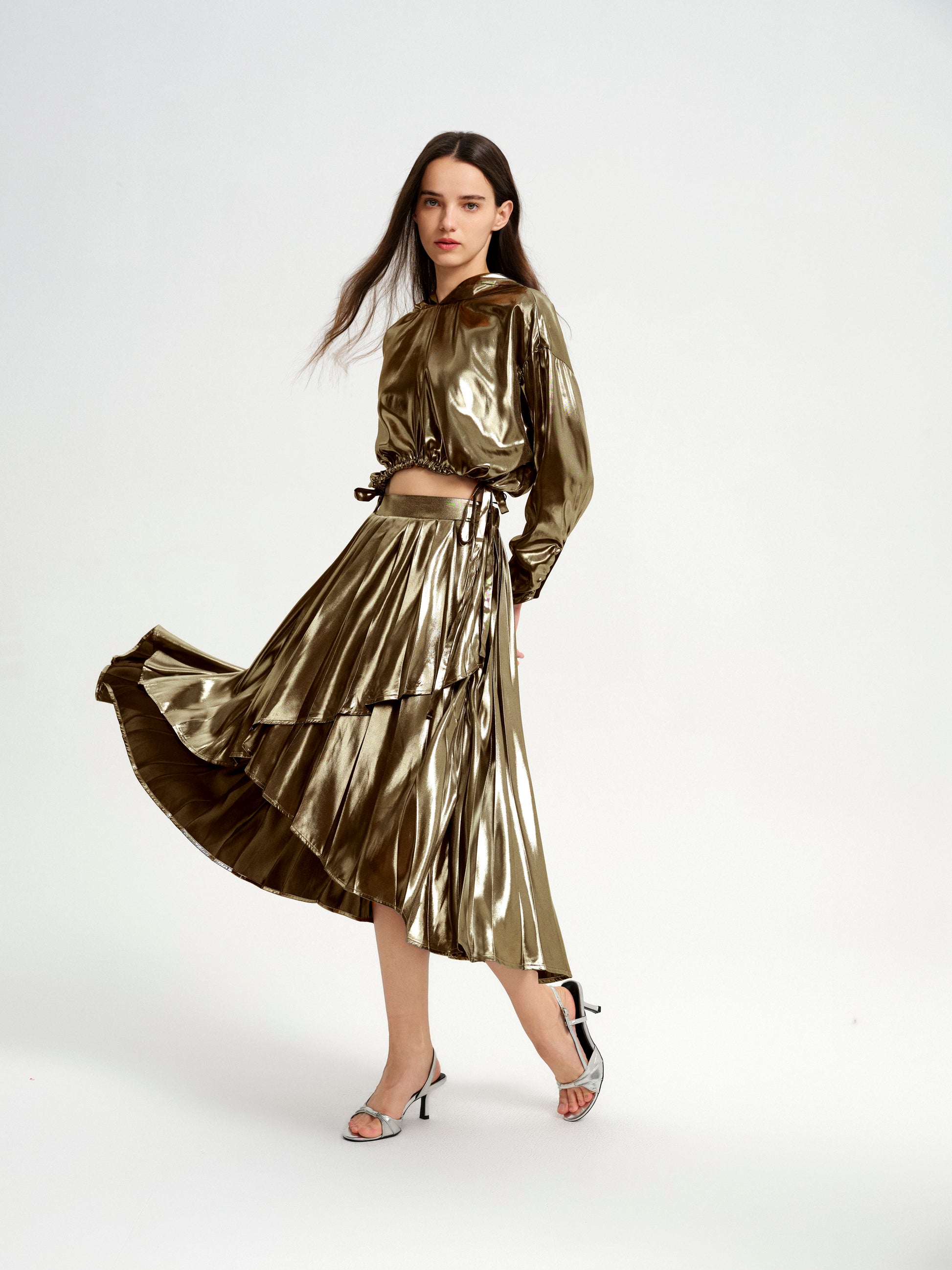 - Asymmetrical high-low pleated skirt crafted from luxurious lamé fabric for a stunning, eye-catching look.