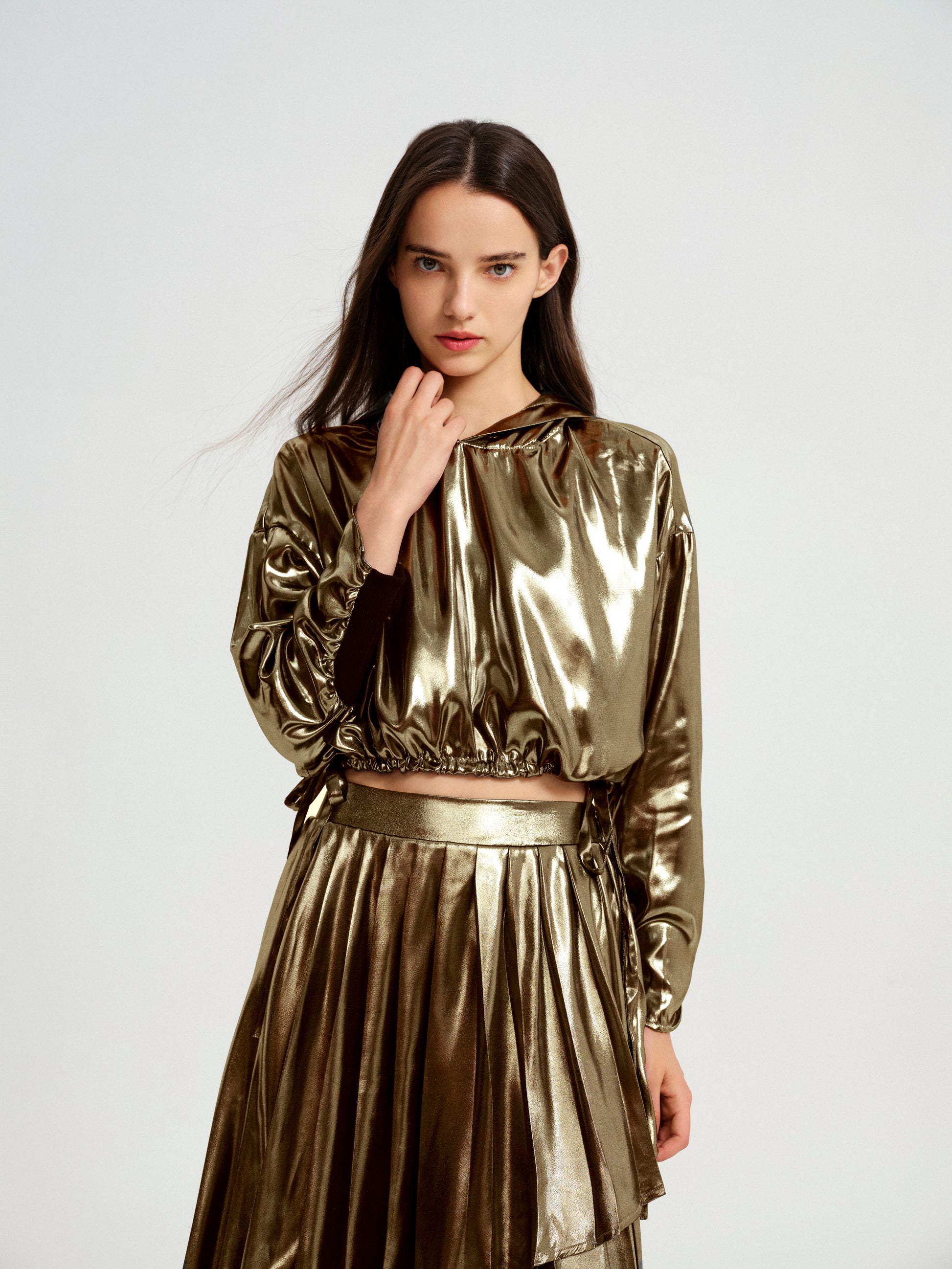 - High-low cropped hoodie made from luxurious lamé fabric, offering a chic and modern look.