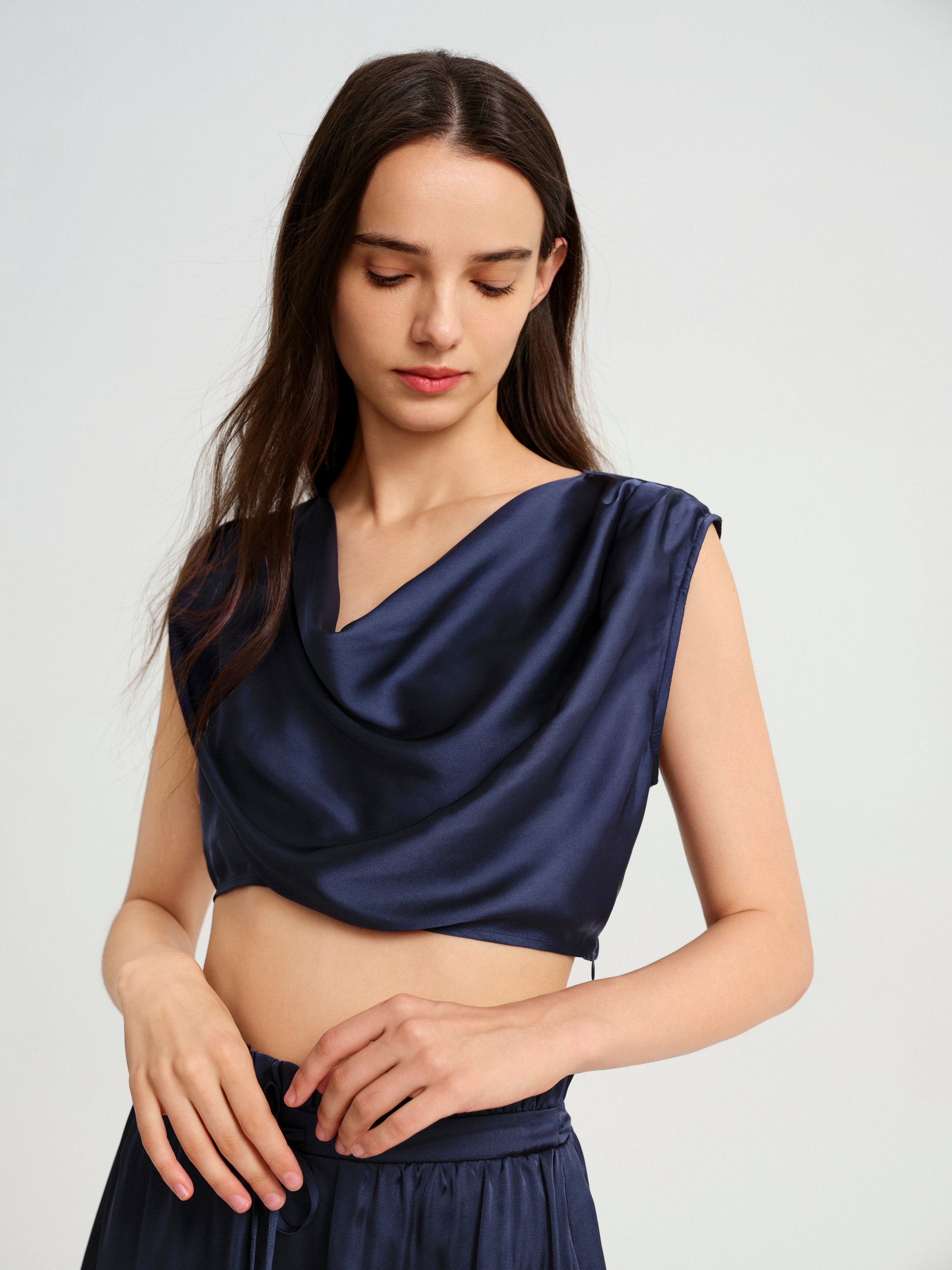 BlisSecret Navy Cowl Neck Cropped Top With Pleated Padded Shoulder & Shorts