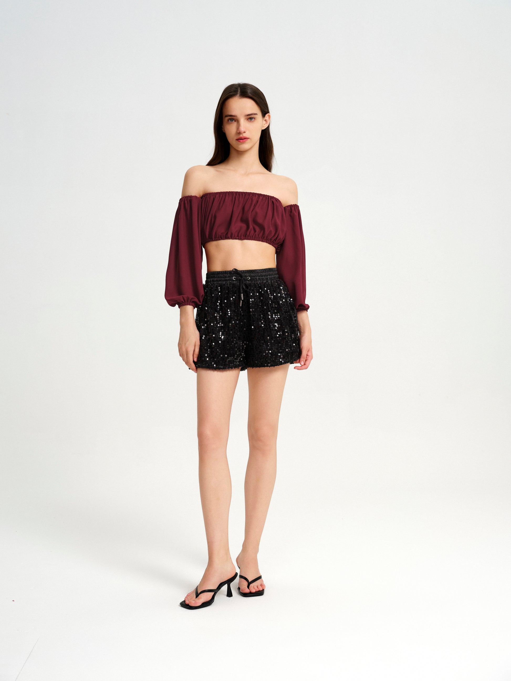 • Off-the-shoulder cropped bubble top with an elastic neckline for a comfortable and stylish fit.